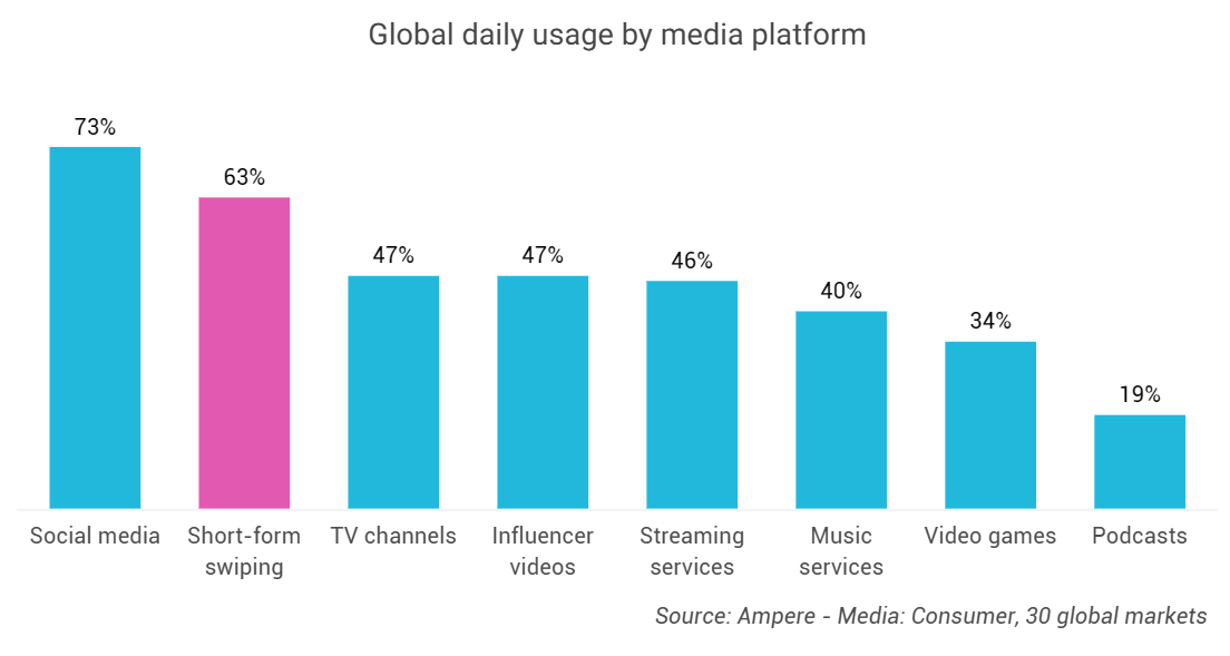 根据Ampere的最新研究,全球超过60%的网民现在每天都会在TikTok、YouTube Shorts和Instagram Reels等平台上观看”滑动式”短视频内容。鉴于社交媒体算法能够预测观众想要观看的内容,Ampere预计这一数字还将继续上升。