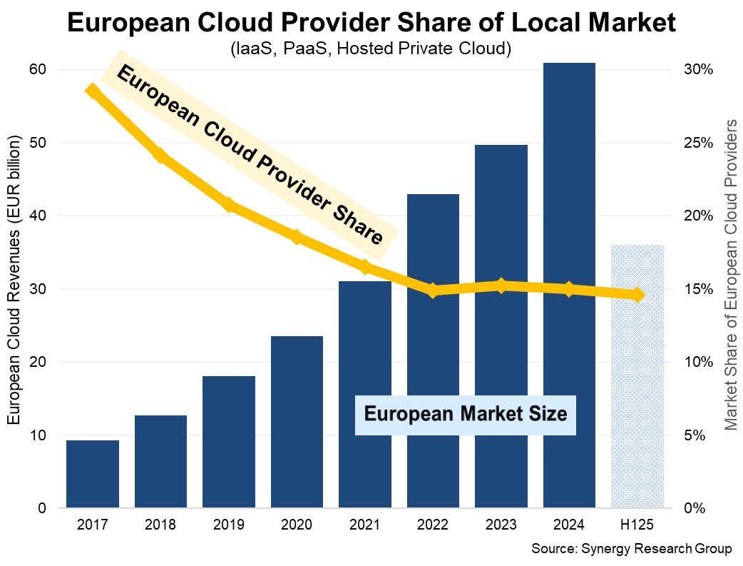 Synergy Research Group的新数据显示,从2017年到2024年,欧洲服务提供商的本地云收入增长了两倍多。然而,在同一时期,欧洲云市场增长了六倍,在2024年达到610亿欧元(700亿美元)。欧洲云提供商的市场份额从2017年的29%下降到2022年的15%,尽管此后一直保持在15%左右的相对稳定的份额。市场增长的主要受益者是亚马逊(Amazon)、微软(Microsoft)和谷歌。这三家领先的全球云提供商目前占70%的区域市场。在欧洲的云提供商中,SAP和德国电信是领先者,各占欧洲市场的2%。紧随其后的是OVHcloud、意大利电信(Telecom Italia)、Orange以及一长串国家和地区运营商。欧洲市场的其余部分由规模较小的美国和亚洲云提供商占据。