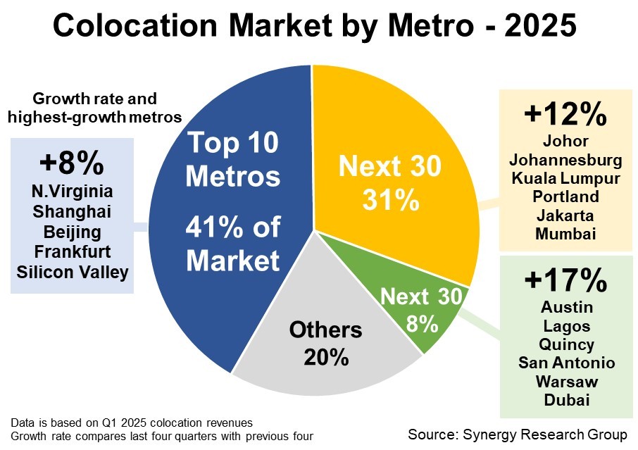 Synergy的最新数据显示,仅10个城市就占目前全球托管市场的41%。北弗吉尼亚是最大的单一市场,占总量的7%。紧随其后的是北京、上海和伦敦,各占总数的5%左右;然后是东京和纽约,各占4%左右。尽管这10个城市占据了主导地位,但下一级城市正在日益重塑托管市场。虽然前十大市场去年平均增长了8%,但接下来的30个市场平均增长了12%,之后的30个市场平均增长了17%。这60座大都市目前占全球市场的39%。