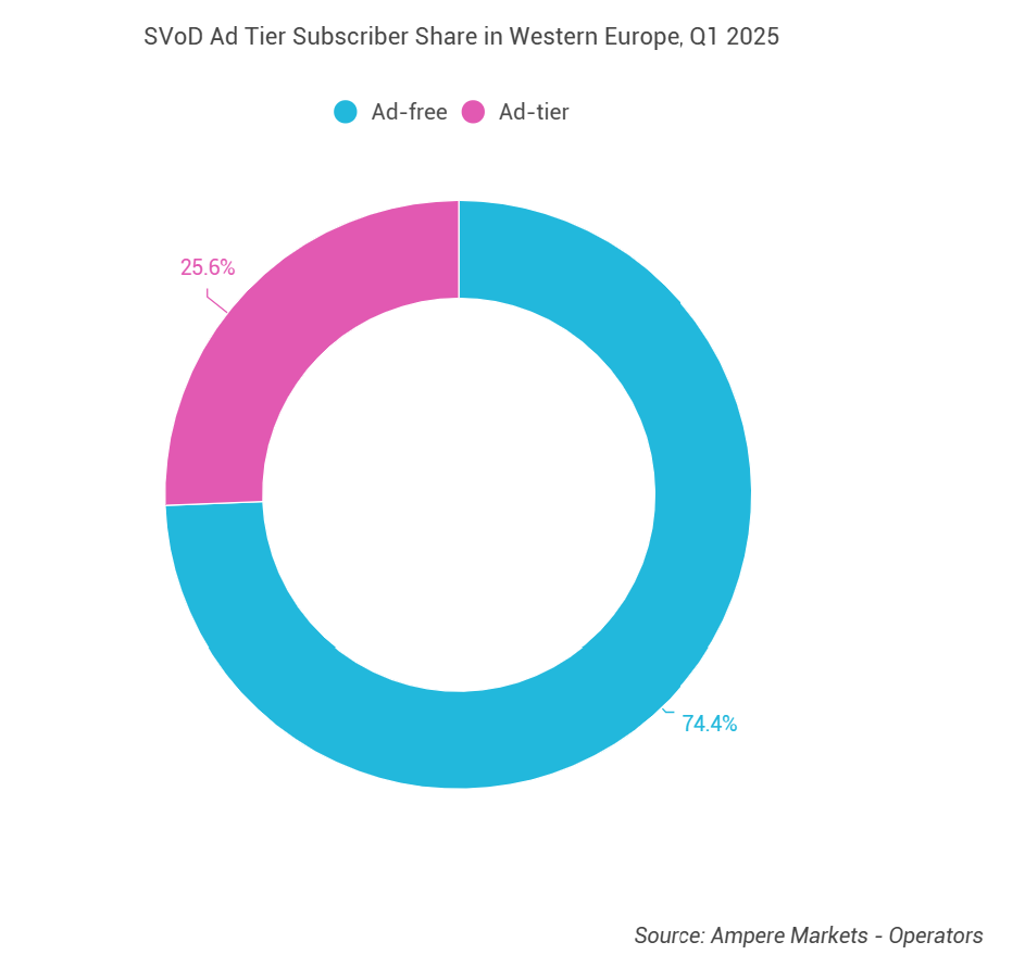根据Ampere的最新研究,广告支持套餐目前占西欧所有OTT订阅量的1/4以上,2025年第一季度总量接近7000万个。仅考虑提供广告套餐选项的服务时,这一比例跃升至所有订阅量的近1/3。随着消费者达到支出上限,流媒体净增用户增速放缓,广告套餐正变得越来越受欢迎。