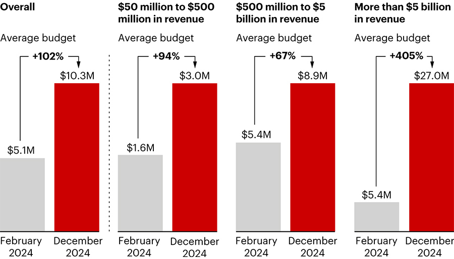企业年度生成式AI相关预算显著增加,从2024年2月起同比增长约100%,整体平均预算达到1000万美元。预期到来年,60%的AI项目将通过常规预算周期获得资金保障,表明AI已成为企业中枢级战略投入的核心板块之一。
